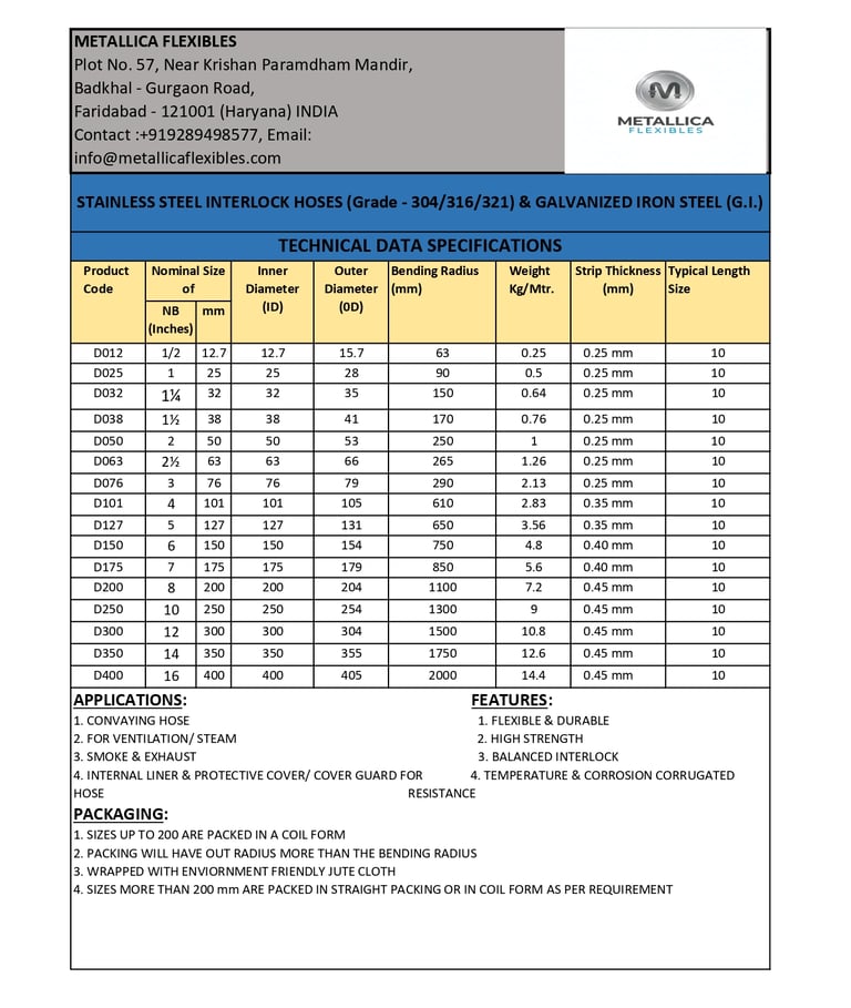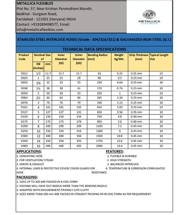 A Double Interlock Metallic Hose is a type of flexible metal conduit designed for applications that require strength, flexibility, and protection. It is commonly used in industrial, mechanical, automotive, and electrical systems to protect wires, convey gases, or handle low-pressure exhaust or ventilation.
